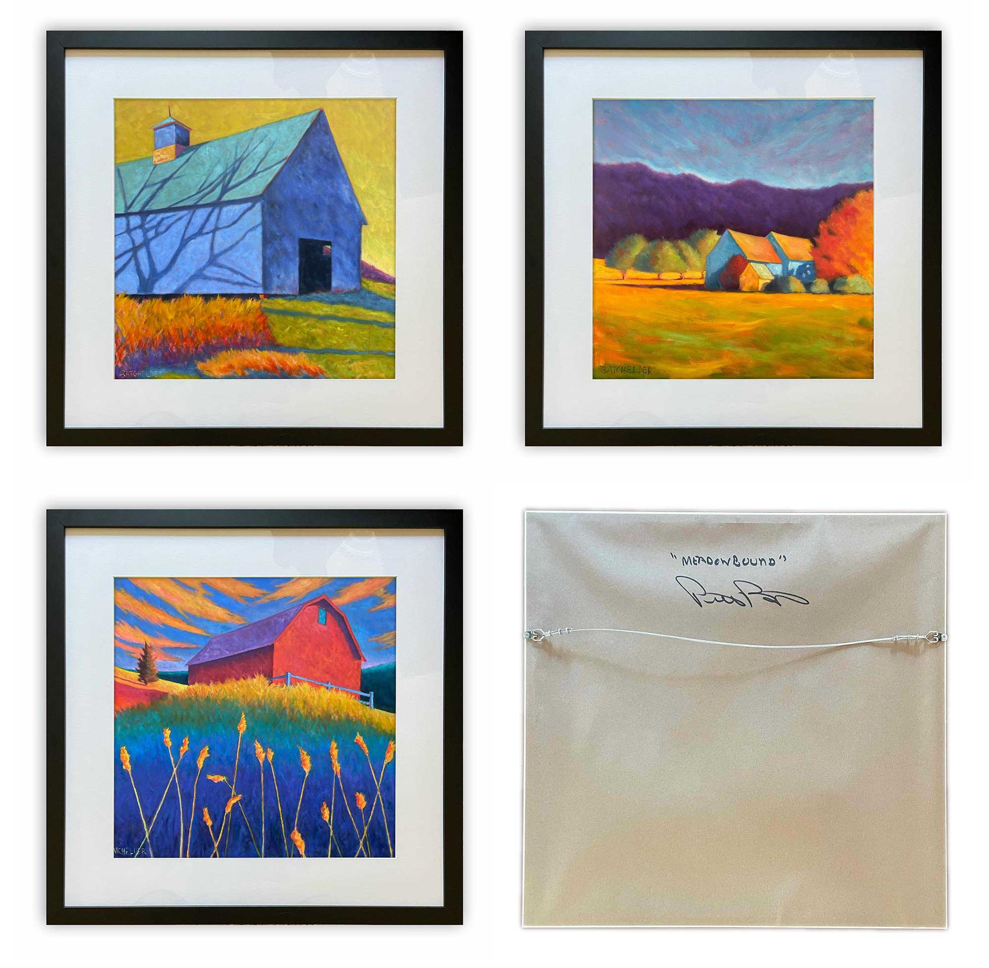 Framed print, available in three images. Each print measures 14" x 14" with 2.5" white mat, framed in black wood frame with acrylic glass. Each print is signed and titled on the kraft backing.
